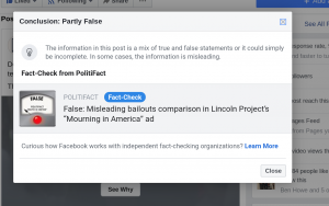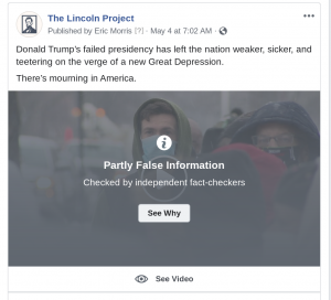After PolitiFact’s rating, Facebook began taking punitive action against the Lincoln Project video, placing warning labels on the video, marking it as “Partly False.”